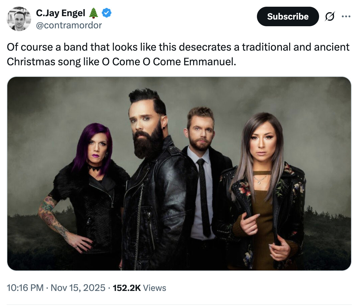 “Of course a band that looks like this desecrates a traditional and ancient Christmas song like O Come O Come Emmanuel.
